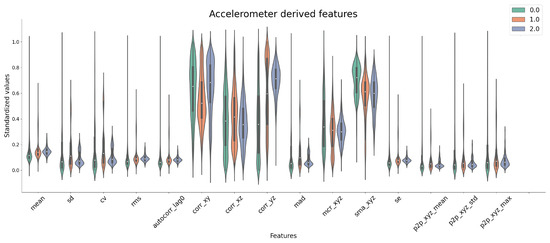 Distribution patterns of each feature across all 3 classes of Tai Chi expertise. NOTES: Class 0 = less experienced group; Class 1 = moderately experienced group; Class 2 = highly experienced group.