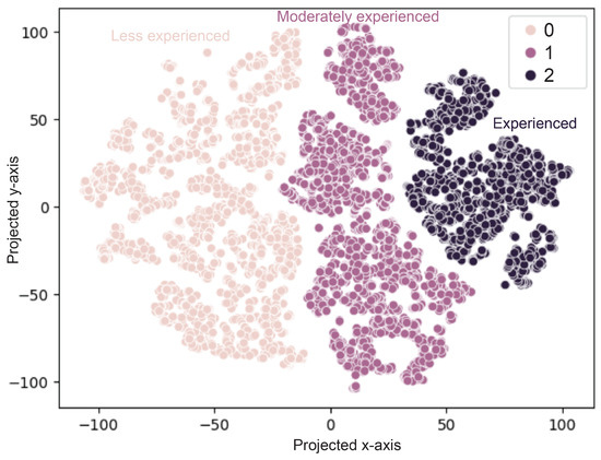 For the t-SNE plot (Figure 4), a plot with perplexity value of 10 showed the potential clustering structure of the data, balancing the attention between local and global aspects of the data structure. The clusters were well separated, indicating an inherent separated structure of the data among different labels, allowing for clear differentiation between the three classes.