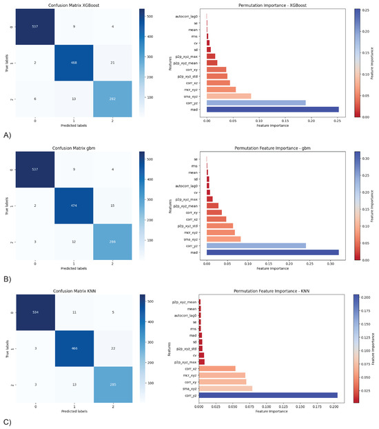 In terms of insight gaining from models, their confusion matrix, performance metrics, and permutation importance was found. For those analyses, a train–test split with 0.2 test size and 0 random state from sklearn was utilized. Permutation importance was utilized to understand each variables’ predictive power brought to the model and the general relationship between movement and TC levels. We evaluated the performance of the models on the basis of accuracy, precision, recall, and -score, all unweighted (micro), placing equal importance on each label.
