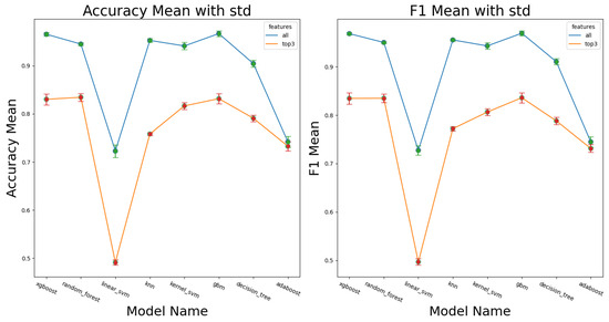 In terms of feature importance, a consensus among the models was found regarding the most influential features contributing to the model’s performance (Figure 5). Specifically, , , and are the most crucial features across most of the models. The accuracy for the top three models (XGBoost, GBM, KNN) using only their top three features decreased by 13.4% (from 96.5% to 83.1%), 13.5% (from 96.7% to 83.2%), and 19.4% (from 95.2% to 75.8%), respectively. This indicates that the top features in these models contributed greatly to the effectiveness of these classifiers, as seen by small drop-off in accuracy or F1 classification performance when using the top three features (Figure 6).