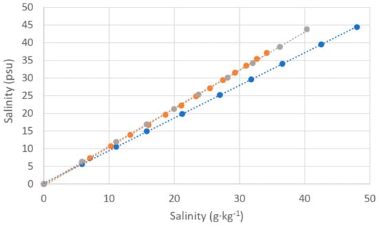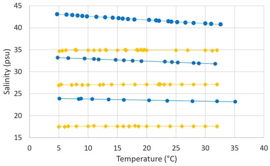 The fact that the drift in salinity measurements with temperature, even when “compensation” is applied, depends on the exact composition of the salt is significant, but otherwise rather not unexpected, since conductivity is already different for different types of salt. From the linear fitting for each concentration of KCl, we can see that it varies more for higher concentrations, while the slope is steeper: −0.08 psu/°C for 38.2 g·kg−1 (linear fit: y = −0.0839x + 43.471, R2 = 0.9968); −0.05 psu/°C for 28.9 g·kg−1 (linear fit: y = −0.0526x + 33.455, R2 = 0.9952) and −0.02 psu/°C for 19.4 g·kg−1 (linear fit: y = −0.0247x + 24.035, R2 = 0.9692). In the worst case, the highest concentration at 30 °C varies around 2.5 psu (0.08 psu/°C), which is a significant variation.