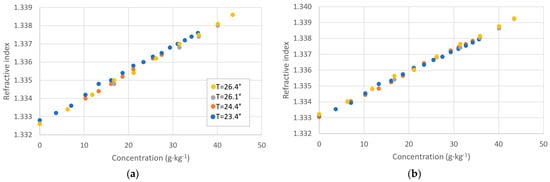 In terms of measuring instruments, we used a commercial salinometer (model 162, ATI Orion, Boston, MA, USA) for the electrical conductivity and an Abbe refractometer (NAR-3T, ATAGO Co., Ltd., Tokio, Japan) for the refractive index. Temperature was measured with the temperature sensor incorporated in the salinometer mentioned before.