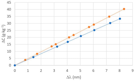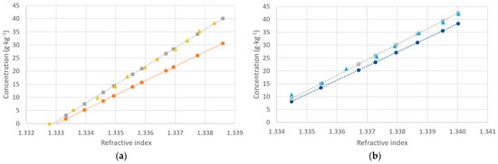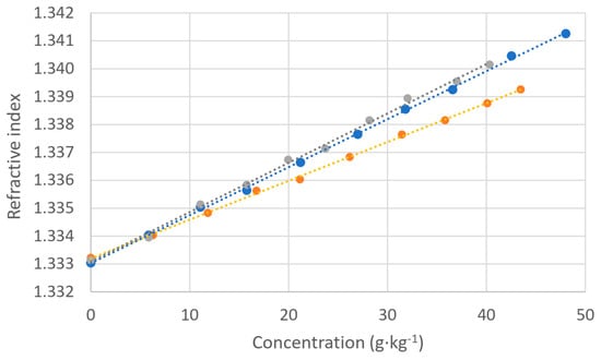 Figure 8. The experimental values are plotted on the main axis (blue), almost covered by the corresponding refractive index values in each case, obtained from the calibration curve of