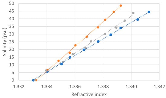 As can be seen, the linearity is quite good in all cases, but again, the behavior depends on the type of salt used. The slopes of the curve fitting are the following: 8026.4 psu/RIU for KCl, 6024.2 psu/RIU for NaCl, and 5362.3 psu/RIU for aquarium salt. We can see that the variation is important and that, for the same value of refractive index, we can have different practical salinities. If we agree that the refractive index is more directly related to the concentration of dissolved salts than electrical conductivity, which is strongly dependent on Cl− ions, this could be significant in real measurements. Again, the curves of NaCl and aquarium salt are nearer than that of KCl because NaCl is higher in aquarium salt than KCl. The effect is more discernible here than if we only account for the electrical conductivity-based measurements of salinity. This could be an interesting feature if the discrimination of the dissolved products is one of the goals of the measurements. If we, for instance, start with an initial calibration, we can determine which curve is to be applied, thus obtaining a more accurate result.