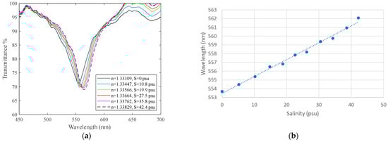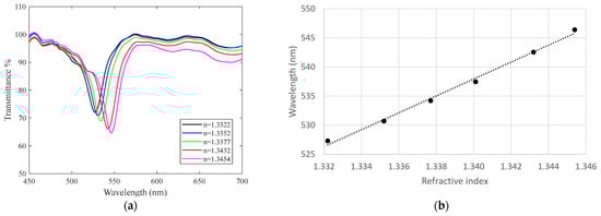 It can be seen that, as it is well known, as the refractive index increased, the minimum associated with the plasmon resonance shifted to longer wavelengths. By performing a linear fit of the minima position, the sensitivity of the sensor to variations in the refractive index can be obtained. In this case,