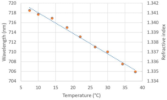 We can also estimate the variation of the refractive index of the medium when the temperature changes from the slope of the experimental data by using the calibration curve of the sensor (the sensitivity of this sensor is 2014.2 nm/RIU). Dividing the latter by the slope in