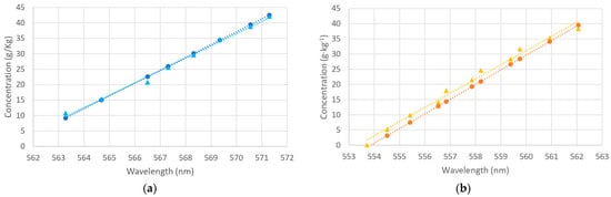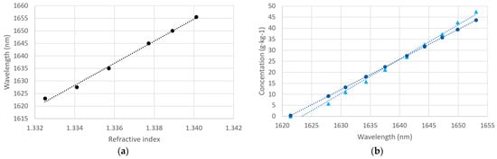 We have obtained a linear behavior again in all cases, and from the linear fitting, we can see that the slopes of the curves are: 1.4·10−4 RIU/(g·kg−1) for KCl; 1.8·10−4 RIU/(g·kg−1) for NaCl and 1.7·10−4 RIU/(g·kg−1) for aquarium salt.