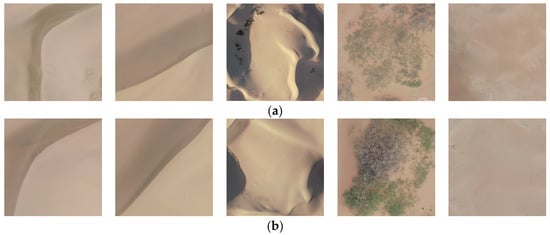 The dataset consisting of 128 × 128 pixels blocks was created with an overlap setting of 10 pixels. Orthoimages of reticulate dunes, barchan dunes, and dune chains captured by UAV were segmented, and then a random selection of data was performed at a ratio of 0.2. Data augmentation was applied to the flat sandy land. This process resulted in a total of 61,624 image data. The dataset was subsequently divided into training and testing sets in an 8:2 ratio, with the specific quantities presented in Table 7. Example images of the datasets with four different segmentation scales are illustrated in Figure 7.