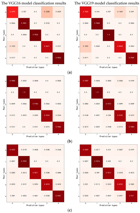 - In the 256 × 256 pixels dataset, the classification performance of the VGG16 model surpasses that of the VGG19 model. The VGG16 model exhibits distinct cluster structures, whereas in the VGG19 model, there is a clear misclassification across various types, with data points showing a pronounced interspersion.