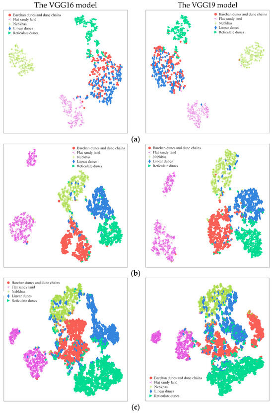 To intuitively analyze the semantic distances between different dune morphology types, t-SNE dimensionality reduction visualization was employed. The outputs from the last fully connected layer of the VGG16 and VGG19 models were used as semantic features. As shown in Figure 11, which illustrates the semantic feature maps for classifications across different datasets, the following observations can be made: