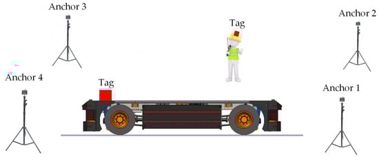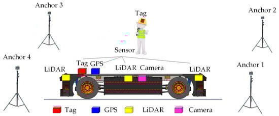 Figure 3 presents the architecture of the proposed UWB system with LiDAR, GPS, and camera functionality, enhancing navigation and safety systems for AGVs. This setup differs from traditional RTLS-based solutions. The proposed AGV safety system should be installed only in crowded and narrow areas at risk of collision. The electric AGV truck is equipped with tags, LiDAR, GPS, and camera sensors, enabling it to determine the real-time location of moving people or assets. Therefore, the proposed safety system is based on real-time location within fixed infrastructure in specific crowded and narrow areas. In open areas or where there is sufficient road space, specialized navigation systems using LiDAR, GPS, and cameras will detect locations and serve as navigation aids.