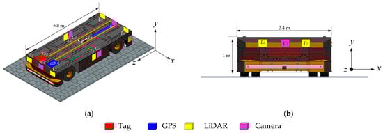 Placement of the tag, LiDAR, GPS, and camera sensors in the E-AGV truck: (a) perspective view; (b) front view.