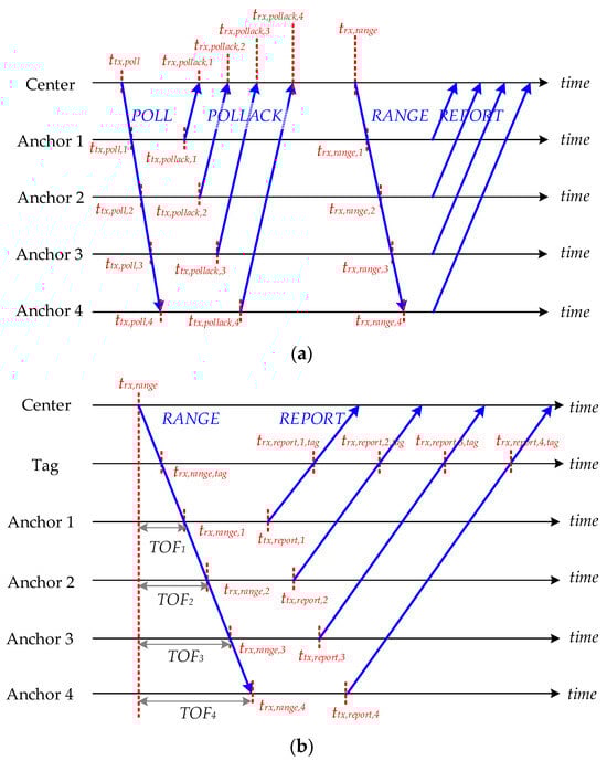 (a) The modified TWR between the center and anchors. (b) TDoA with anchor synchronization.