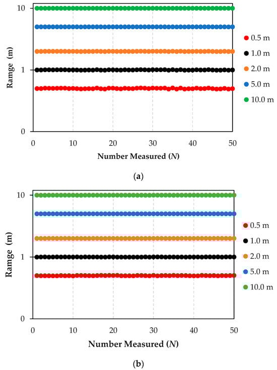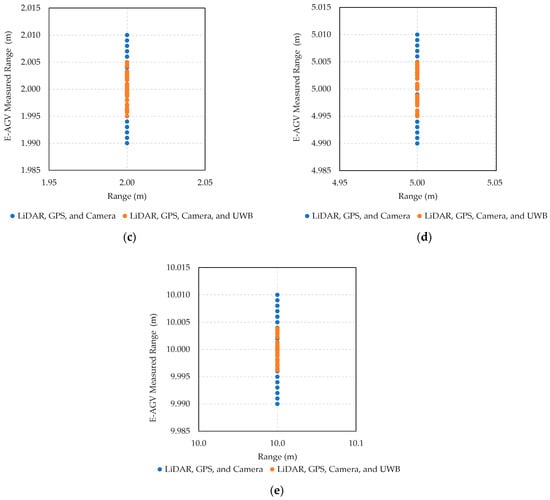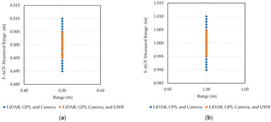 At the 0.5 m distance (Figure 10a), the LiDAR, GPS, and camera setup exhibited measurements ranging from 0.490 to 0.510 m (blue dot), resulting in a maximum error of 2%. With the addition of the UWB sensor, the measured values were more tightly grouped from 0.495 to 0.505 m (orange dot), reducing the maximum error to 1%. This pattern of improved accuracy with the inclusion of UWB was consistent across all tested distances (Figure 10b–e). The integration of UWB enhances the precision of the navigation system, effectively reducing measurement errors, which is crucial for operational safety and efficiency in industrial settings. Additionally, the use of the Kalman Filter algorithm helps in correcting any discrepancies, further stabilizing and refining the system’s accuracy across various environmental conditions and operational scenarios.