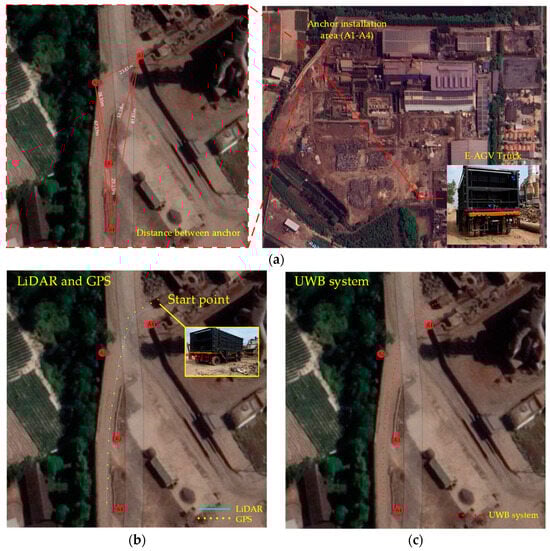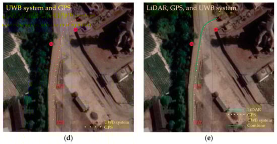 Testing autonomous electric trucks in real factory locations in conditions using different sensors for navigation: (a) installing anchors (A1–A4) in narrow road areas in factories; (b) GPS and LiDAR; (c) UWB sensor; (d) GPS and UWB sensors; and (e) LiDAR, GPS, and UWB sensors.
