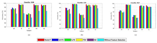 - Classifier diversity: Finally, we fed the reduced feature vector into the classification algorithm to generate the probabilistic maps, aiming to leverage their respective strengths, enhancing the robustness and accuracy of the classification results. We implemented a diverse set of advanced classification algorithms (SVM, LDA and MLP) to process the reduced feature vector and tested the performance of Relief-F algorithm.