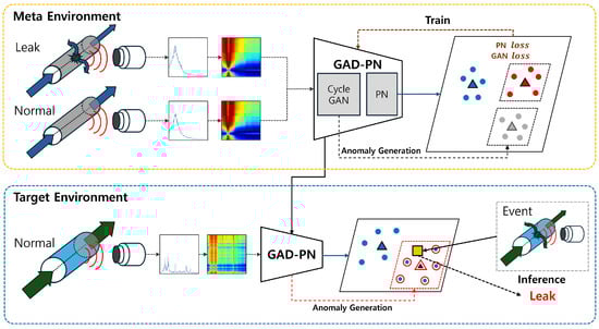 In meta-learning-based unsupervised learning approaches, research has explored adopting the training method known as MAML. This has the advantage of being easy to apply to models based on gradient descent by learning initial parameters that adapt quickly. It is easily combinable with existing traditional unsupervised anomaly detection models, and recently MAVAE [] has been proposed. MAVAE uses variational autoencoders (VAEs) [] to train the initial parameters of the VAE using the MAML method. Subsequently, during the inference process, the VAE is fine-tuned with a small number of normal data, enabling effective anomaly detection, even with limited data. Most research on meta-learning-based supervised learning approaches has adopted the PN method. FSL-PN [], which applies contrastive loss, or PRN [], which introduces a method for reconstructing anomaly segmentation maps using a multi-scale self-attention module, have been proposed. Each model demonstrated stability and high detection performance during training, but they require labeled anomaly data. In this paper, we assume that leakage characteristics in different environments are similar in the context of plant pipeline leakage scenarios. Therefore, by integrating a generative model capable of domain transformation with PNs in the GAD-PN structure, high detection performance can be achieved with the input of only a small number of normal data input.
