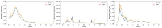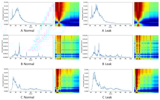 Based on the data collection environment described in Section 3.1, we collected the experimental dataset in this paper. To collect diverse datasets based on different experimental environments as described in Section 3.1, data were collected from three experimental environments, labeled A, B, and C, in which parameters such as the fluid pressure and hole size of the pipe were set differently. Depending on the features of the data, they can be analyzed and collected using methods such as autocorrelation functions, correlation functions, time-frequency patterns size analysis of measurement data, etc. The dataset includes normal and leakage data collected for learning and evaluation according to the time/frequency domain and the features of the ultrasonic signal. The average representations of normal and leakage data in the scenario are shown in Figure 2.