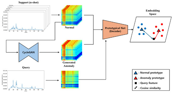 Recently, research in meta-learning-based anomaly detection has also aimed to bridge the gap between simulation data and real-world environmental domains [,]. Meta-learning is a learning method that enables AI-based anomaly detection models to rapidly adapt to new environments, using an approach called “learn-to-learn” []. In other words, the model learns how to learn in different environments, allowing it to learn effectively with only a small number of data. MAML [] and Prototypical Networks (PNs) [] are two representative methods of meta-learning. The MAML-based approach involves training the initial parameters of a model’s neural network to rapidly adapt to new domains. It provides the advantage of seamless integration with existing supervised and unsupervised AI methods. However, unsupervised learning-based anomaly detection, which requires extended training periods and utilizes only normal data, may struggle to accurately capture the distribution of normal data. PNs represent a supervised learning approach to categorize anomalies by measuring distances and similarities between class prototypes and new data in the learned embedding space. Specifically, PNs generate a prototype for each class using n support data points. Once query data are entered, the model can be updated to compare similarities with these prototypes and to maximize similarities with the same class. By using metadata from various environments, it becomes possible to rapidly adapt to a new environment with limited data. Moreover, it achieves high anomaly classification performance with only a few abnormal data. However, it still requires some abnormal data, making it difficult to apply in environments where such data are difficult to collect.