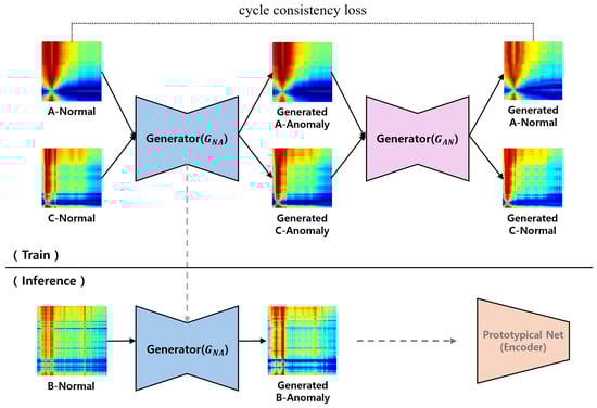 In this paper, we proposed a Generative Anomaly Detection using Prototypical Networks (GAD-PN) framework designed to detect anomalies using a small number of normal data. The method adopts CycleGAN [] to generate abnormal data from normal data, which are subsequently used by PNs for anomaly detection. Based on the proposed generative model, we make the following assumption: if A and B are normal data, and and are abnormal data, then can be generated from C by leveraging the characteristic ‘’. Based on this assumption, we train the CycleGAN model using data that closely reflect the characteristics of the target deployment environment. This allows PNs to generate normal and abnormal prototypes to perform inference using only normal data. In addition, in this paper, numerical sensor time series (TS) data are converted into images via a Gramian angular field (GAF) transformation for pre-processing. By leveraging the robust feature extraction capabilities of Convolutional Neural Networks (CNNs), we can achieve higher accuracy with image data compared with TS data. The overview of our proposed structure is shown in Figure 1. This approach effectively resolves the challenges associated with collecting normal and abnormal data in real-world environments, as well as mitigating the complexities arising from environmental differences.