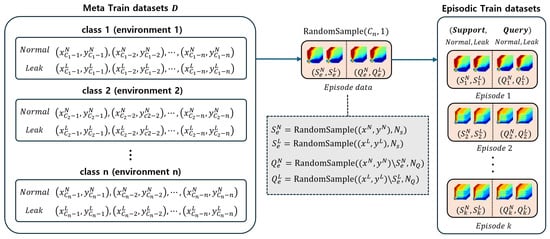 In this paper, the PN was adopted to achieve anomaly detection using a small number of normal data from each environment and the leakage data generated in Section 4.2. The PN is a type of metric-based meta-learning model that classifies data by evaluating the similarity between the data to be inferred and the prototypes of each class within an embedding space. By repeatedly learning from environments and randomly sampled data, it is possible to achieve high classification performance, even with limited numbers of data. Furthermore, since classification is similarity-based, it can avoid potential problems that could result from differences between CycleGAN-generated anomaly data and the target domain’s anomaly data. To train the PN, it is necessary to create episodic training datasets using normal and leakage data from environments different from the inference environment. As shown in Figure 6, this process transforms training data with multiple episodes, and the classes of each episode are randomly sampled. Each episode is divided into support data and query data, both of which are randomly sampled and different from each other.
