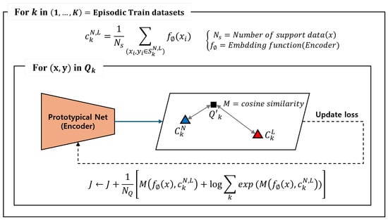 During training, the support data pass through the CNN encoder layers and are mapped into the embedding space. The mapped data are used to create prototypes by calculating the mean for each class in the matrix. Subsequently, the query data are also mapped into the embedding space using the same encoder, and the similarity between the prototypes is measured based on a specified metric. In this paper, a typical metric method of the PN includes Euclidean distance and cosine similarity, and cosine similarity is adopted. Based on the measured similarity, the model is updated, and iterating through multiple episodes ensures that the model can effectively classify normal and abnormal, even in new environments. During inference, a small number of data from the target domain are used to create the prototypes. After that, the inference data are classified into the class with the highest similarity to the prototypes for each respective class. The training process of the PN is described in Figure 7.