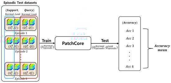 In GAD-PN, while it receives a small number of normal data from the environment for inference, it is not a fully zero-shot anomaly classification. Therefore, we further compared it with a few-shot-based unsupervised anomaly detection that receives only normal data. For the comparison, we used PatchCore trained on few-shot data. PatchCore has shown high performance in general image anomaly detection, and, more recently, models based on it have shown higher performance. In this paper, we operated under the assumption of a limited number of training samples in the inference environment. Therefore, we conducted experiments using the same 100 episodes as GAD-PN in Section 5.2.1. In each episode, the model was trained with 5 normal support data samples and then tested with 15 normal and 15 leak query data samples, similar to the GAD-PN evaluation procedure. The accuracy of 100 episodes was averaged and the evaluation method is shown in Figure 8, and the results are shown in Table 5.
