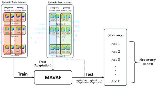 MAVAE is a model that combines MAML and VAE for few-shot learning. It enables few-shot anomaly detection by learning initial parameters that rapidly adapt to new environments using metadata. In this paper, MAVAE learned metadata from different environments in an episode format. In the inference process, as outlined in Section 5.2.1, we adapted using 5 normal support data samples, the same as in GAD-PN, and evaluated based on 100 episodes consisting of 15 normal and 15 leak query data samples, as illustrated in Figure 9. The results shown in Table 6 demonstrate the average binary classification accuracy of the query data.