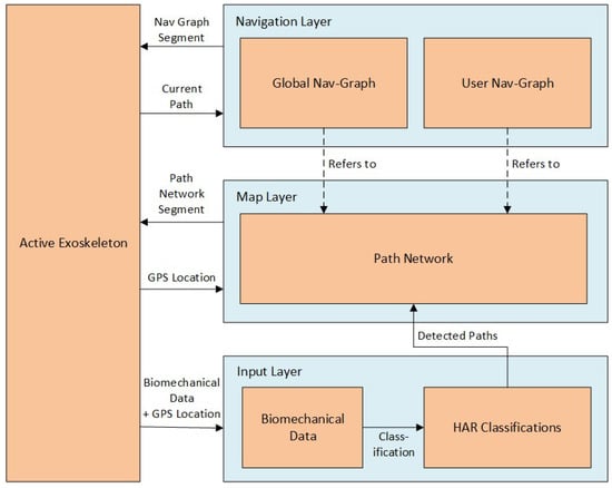 From bottom to top, the first layer is the input layer. It contains raw sensor information as well as classification results of individual steps. The data of the input layer is supplied by the sensors located on the exoskeleton. The data is then split into steps and classified by an HAR algorithm to determine the type of activity. We keep the data in the input layer to make the resulting map reproducible.