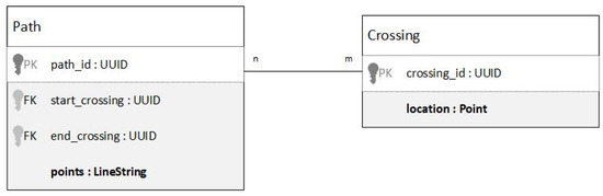 The ‘path’ entity holds a single path. We use special spatial datatypes provided by the database to define the actual path, which is a sequence of geographical points. A path can, both at the start and the end, be connected to many other paths via a crossing. The connection is determined by the ID of the crossing. In this way, two n-to-m relationships between paths and crossings are implemented: one for connections to the start point of a path, and one for connections to the end point. The location of a crossing can be implicitly determined by looking at the location of the start point and the respective end point of the connected paths. However, by storing the location of a crossing in the crossing entity itself, crossings can be looked up via their location.