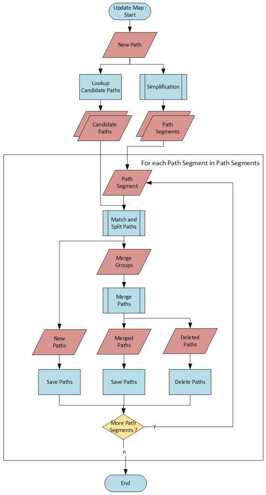 The map construction algorithm is iteratively applied to each path added to the map. The flowchart in Figure 3 shows the algorithm. Since the algorithm cannot insert paths that contain loops, the path is first simplified. Simplification results in one or more non-self-intersecting path segments. Then, all paths which might be matching the new paths (candidate paths) are looked up. The lookup is performed by filtering all paths that intersect with the new path’s bounding box. Now, the map insertion algorithm is applied to all simplified path segments. Each path segment is matched with the candidate paths. The matching segments are split into groups of matching paths (merge groups) and non-matching paths. Non-matching segments of the new path have not yet been made part of the map. They are inserted into the map as new paths. The merge groups are combined (merged) using a weighted average of the number of times the paths were previously merged. After merging, a new path results from the combination of the two matching segments. The two input paths are no longer needed and are deleted.