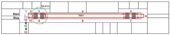 The performance of the classifier was verified using a dataset recorded by SensAA, a wearable, IMU-based biomechanical data acquisition system introduced in our previous publication [15] The system provides three-axis acceleration and angular velocity measurements. In addition, the inclination of the sensor in the sagittal plane is recorded. The average sampling rate is ~30 Hz. The dataset was recorded indoors at Aalen University, at a long doorway that included two staircases. Figure 4 shows the track used for data acquisition. The track consists of two staircases and a 46 m long hallway. Both staircases consist of 21 steps. Each staircase is separated into two stairs. The upper staircase has 11 steps, and the lower staircase has 10 steps. The steps are divided by a 1.6 m wide plateau.
