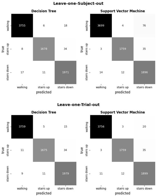 Confusion matrices of the leave-one-subject-out and leave-one-trial-out verification of the Decision Tree model and the Support Vector Machine model.