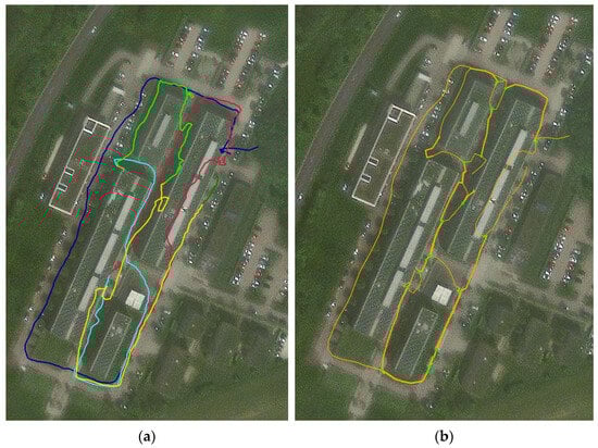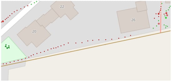 Two common approaches in map construction are the “raster map” and the “vector map”. Raster maps are stored as a grid of pixels, while a vector map stores the geometries as vector information [26]. Raster maps allow for faster computations of many spatial analysis methods, but only vector maps can store geometries, like a roadway, accurately [26,27]. A vector map can be converted to a raster map by rendering it into an image. In contrast, deriving vector data from raster data requires complex calculations [28]. Constructing maps from GPS traces has already been thoroughly discussed. However, most algorithms are designed to recreate roadways from GPS traces recorded by cars. Bruntrup et al. proposed such an algorithm [29]. They subdivided a map into tiles for faster access and used machine learning methods to infer the road geometry. The road was stored as vector information [29]. Zhang et al. proposed a map construction algorithm for creating road maps from GPS traces [30]. In contrast to Bruntrup’s algorithm, their map construction algorithm creates a raster map. The key feature of their method is that the raster map can be compressed to lower the resolution while still maintaining topological correctness [30]. Kasemsuppakorn et al. [31] developed an algorithm for automatically generating a network from GPS traces for paths used by pedestrians. In their work, they mainly focused on sidewalks. The network was generated using self-collected GPS traces and publicly available traces from the Open Street Maps (OSM) project. The algorithm was evaluated using the metrics of geometrical correctness and topological correctness as proposed by Wiedemann et al. [32]. The evaluation resulted in an average geometrical correctness of 57.55% and an average topological correctness of 76.9%.