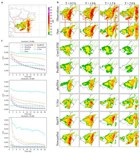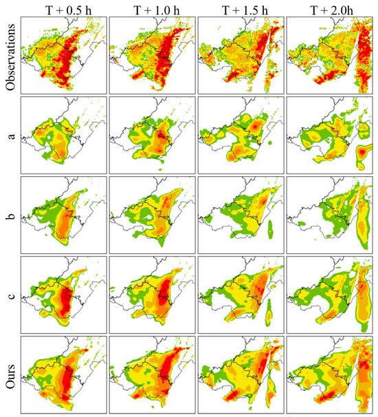 - Removing the STLoss function results in the CSI indices differing by 7.3%, 10.6%, and 1.4% under 20 dBZ, 30 dBZ, and 40 dBZ reflectivity thresholds, respectively. Additionally, in visual images, using the STLoss function results in more accurate predictions of the area and intensity of echoes at medium and high thresholds. Therefore, it can be seen that the STLoss function improves the prediction accuracy of medium and strong echoes to a certain extent.