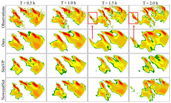 - Specific local regions marked with red boxes and arrows in Figure 3 illustrate significant changes in echo intensity. The MS-DD3D-RSTN model accurately predicts the trend of radar echo sequences, closely matching actual conditions in most regions. Overall, the MS-DD3D-RSTN model not only enhances the accuracy of short-term precipitation forecasting to some extent but also exhibits commendable performance in handling long-term dependencies.