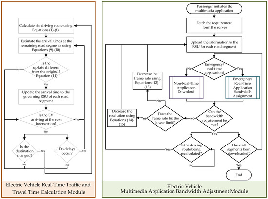 Flow charts of “Real-time Traffic and Travel Time Calculation” module and “Multimedia Application Bandwidth Adjustment” module.
