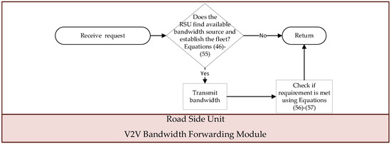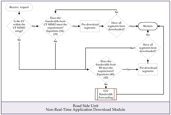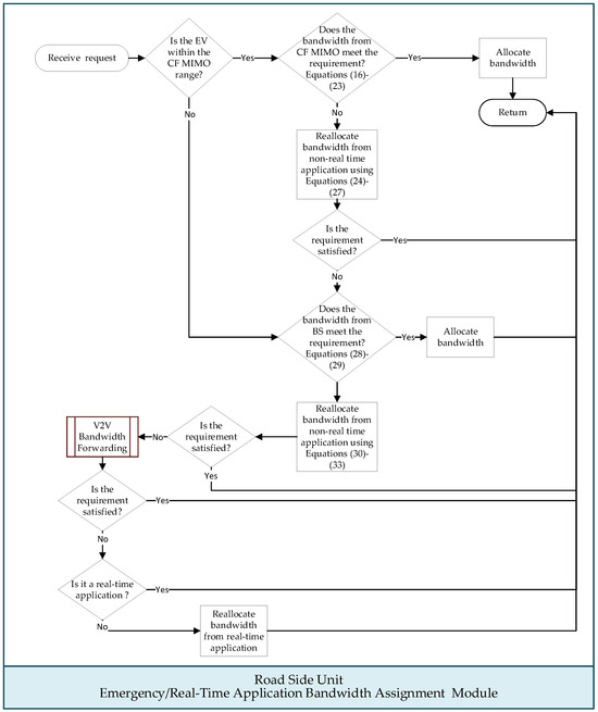 If the EV is not within the coverage area of any CF mMIMO architecture, the RSU will check whether the base stations along the route can provide the necessary bandwidth for the emergency or real-time application. If none of the base stations within the EV’s communication range can provide sufficient bandwidth, the RSU will examine whether these base stations can reallocate bandwidth initially allocated to non-real-time applications. If bandwidth reallocation is performed but the requirements for emergency or real-time applications remain unsatisfied, the RSU will activate the “V2V Bandwidth Forwarding” module to obtain bandwidth from base stations or CF mMIMO architectures in less congested areas. Given that emergency applications should have the highest priority for bandwidth allocation, if the V2V bandwidth forwarding still cannot meet the bandwidth demands for emergency applications, the bandwidth initially allocated to real-time applications will also be reallocated to the emergency applications.