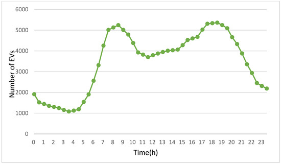 - The binary flag is used to control whether the road segment connecting and allows the EV to pass at time . For example, during peak hours, if the traffic control center designates the road segment between and as a key controlled segment and prohibits the EV from driving on it, then is set to 1; otherwise, it is set to 0.