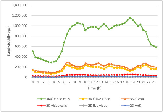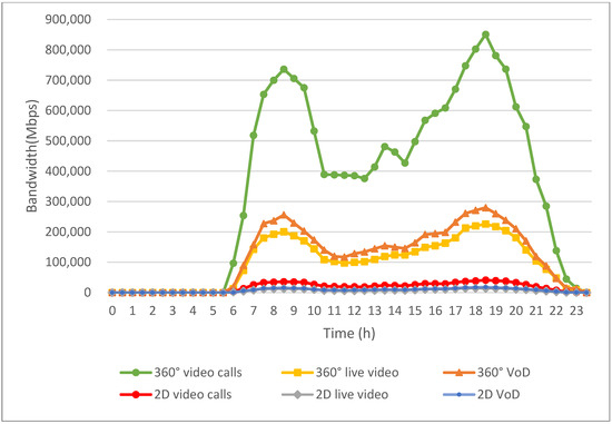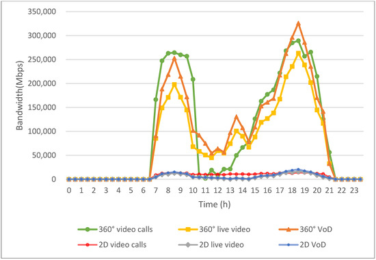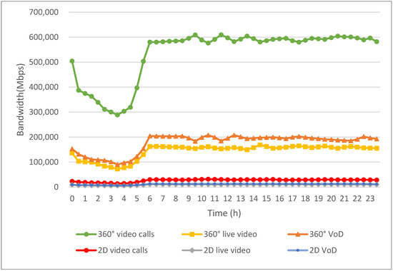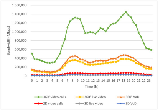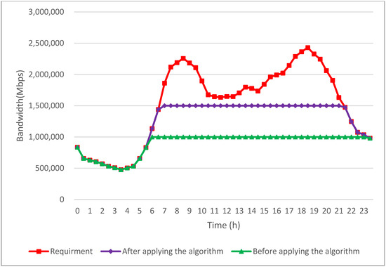 Figure 15 presents a comparison of the overall bandwidth requirements for all multimedia applications during a day before and after the implementation of the proposed work. During the early hours, from midnight to 5:30 a.m., bandwidth demand remains relatively low across all multimedia applications. Consequently, existing bandwidth resources generally meet these demands adequately without requiring intervention from the proposed algorithm.