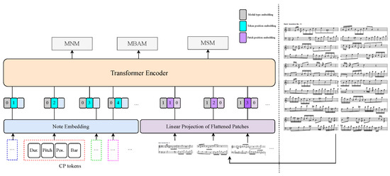As shown in Figure 1, the entire architecture of the proposed SIM is a Transformer-encoder-based framework. The SIM model employs Compound Word-based (CP-based) MIDI music representation for symbolic music input. To suit the patch-based processing paradigm of Vision Transformer [28], we customized the image process for music score images. Specifically, we segmented the score images into patches based on music bars, resulting in an arrangement of 6 × 2 patches (as illustrated on the right side of Figure 1).
