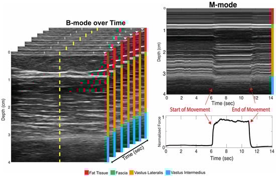 Researchers have previously shown that the use of motion mode (M-mode) ultrasound imaging can be a viable alternative to traditional B-mode imaging in investigating time-varying muscle deformation [44]. M-mode involves imaging a single ultrasound scanline over time, allowing muscle motion to be monitored more efficiently [33,45]. Utilizing M-mode imaging allows for simpler electronics, smaller device footprints, lower computational requirements and the incorporation of multiple imaging sensors.