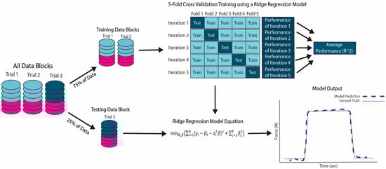 Schematic of ridge regression models for training and testing. Data were compiled (blue = image data, pink = force data) for each trail and then split into training blocks (Trials 1 and 2) and testing blocks (Trial 3) for each subject). A 5-fold cross-validation was used for training the ridge regression model and performance was reported as R2. Testing of the model was performed utilizing the Trial 3. The model output shows the ground truth force (N) (solid pink line) compared to the model prediction force (N) (dashed blue line).