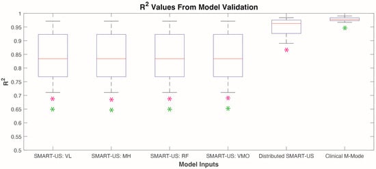 The six categories of M-mode image data were analyzed independently for cross-validation analysis using the method outlined in Figure 3. Results showed that the Clinical M-mode performed the best with an R2 value of 0.98 ± 0.01 (Figure 4). The next best was the Distributed SMART-US model as the inputs showed an R2 of 0.95 ± 0.03. Finally, for force prediction using an individual SMART-US sensor, the results were as follows: SMART-US: VL = 0.85 ± 0.09, SMART-US: MH = 0.82 ± 0.10, SMART-US: RF = 0.85 ± 0.07, SMART-US: VMO = 0.74 ± 0.14. Model validation results violated Levene’s test. Therefore, a Kruskal–Wallis test was used to indicate significant difference between model conditions (p < 0.0001). A post hoc Tukey’s test showed that the Clinical M-mode model and the Distributed SMART-US were both significantly different from the SMART-US: VL, SMART-US: MH, SMART-US: RF, SMART-US: VMO (p < 0.0001) (Figure 4). There was no significant difference between the Clinical M-mode and Distributed SMART-US models.