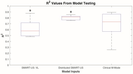 Online testing using the last trial was conducted on the two models that were not significantly different in the cross-validation (i.e., Distributed SMART-US and Clinical M-mode). The SMART-US: VL was also included in model testing, as the sensor was placed in the same location as the Clinical M-mode sensor. Model testing data did not violate Levene’s test (p = 0.66) and a two-sampled t-test was used to indicate significance between model types. Results showed that the Clinical M-mode model had an average R2 of 0.68 ± 0.25, SMART-US: VL model had an average R2 of 0.62 ± 0.16, and Distributed SMART-US mode had an average R2 of 0.80 ± 0.04 (Figure 5). Two-sample t-test indicated that only SMART-US: VL vs. Distributed SMART-US models were statistically significant from each other (p < 0.05).