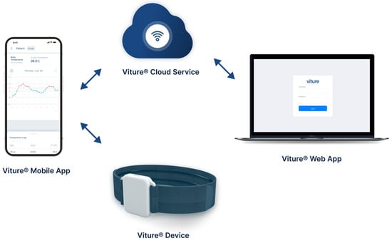 Viture® (Figure 1), developed by Vitio®, is a 24-h CTT system, certified as a Class IIa medical device according to MDR 2017/745 and implemented following the HL7 FHIR healthcare standard protocol for information exchange. It is composed of four elements: the Viture® device, the Viture® mobile app, the Viture® web app, and the Viture® cloud service. The Viture® device (Figure 1) is an easy-to-use, reusable wearable that consists of a comfortable armband with a sensor element that is placed on the user’s arm, under the armpit, which captures axillary temperature at a sampling period of 15 s and transmits the data in real time via BLE. The operating temperature range of the sensor element is [−40, 85] °C; however, the clinical measurement range is [34, 43] °C as the typical range for axillary body temperature. The data emitted by the device are captured by the Viture® mobile app running on a smartphone within its coverage range. The smartphone sends all the collected information to the Viture® cloud servers via the mobile network. In addition, the Viture® device has a flash memory in which the temperature data are stored to prevent data loss and a replaceable battery that lasts a minimum of one year. Once in the cloud, the data can be consulted both from the Viture® mobile app and web app. Additionally, the system sends notifications to the Viture® app when a predefined axillary temperature threshold (37.5 °C) is exceeded.