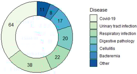 Patient diseases. Of the 180 patients, 35.6% had COVID-19 and 64.4% presented with other infectious diseases, such as a urinary tract infection (21.1%), a respiratory infection (12.2%), a digestive pathology (11.1%), cellulitis (9.4%), bacteremia (4.4%), and other pathologies not indicated above (6.1%).