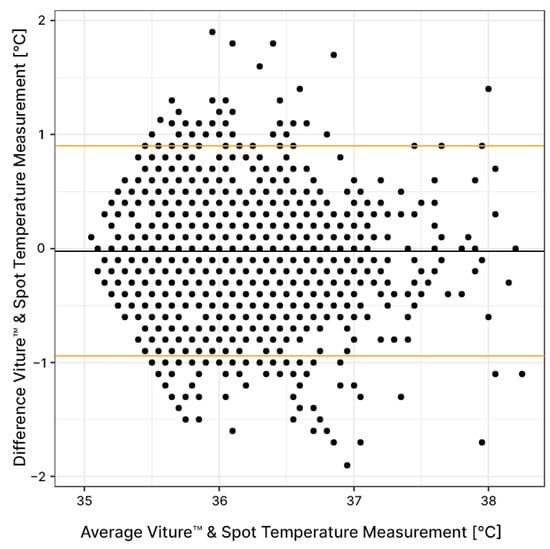 Bland–Altman plot. The difference between Viture® and control spot temperature measurements is displayed versus the arithmetic mean of the temperatures recorded by both methods (black dots). The results show a clinical bias of −0.02 °C (gray line) with limits of agreement of −0.96/+0.92 °C (orange lines) with a 95% acceptance rate.