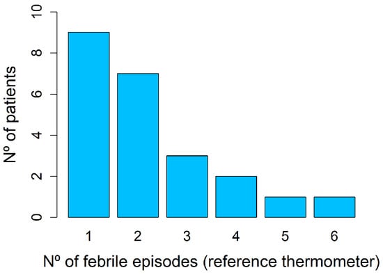 Histogram that illustrates the distribution of patients experiencing a varying number of febrile episodes according to the reference thermometer. In total, 51 febrile episodes corresponding to 23 patients were detected with spot temperature measurements.