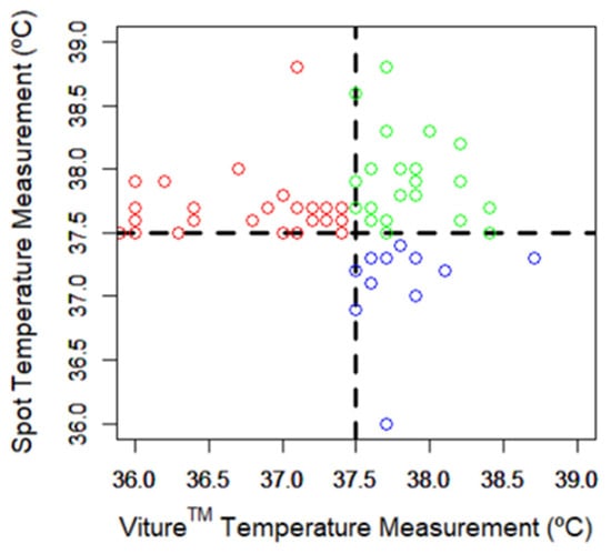 Figure 5 shows a scatter plot of the 64 pairs of control STM and VTM data where at least one of the temperature values was equal to or above 37.5 °C (green, 22 both values; blue, 13 only Viture® measurements; red, 29 only spot measurements). Of the 51 febrile episodes detected with spot measurements, 22 were simultaneously detected by Viture®, 26 cases generated a Viture® notification within ±2 h, and 2 cases generated a Viture® notification within ±12 h. Only in one case, where the control STM was 37.5 °C, did Viture® fail to trigger a notification because it only reached a maximum of 37.4 °C. Viture® reported 48 (94.1%) of the febrile episodes detected by the reference thermometer and in 22 (95.7%) of the 23 patients. Therefore, the sensitivity and specificity of Viture® in detecting febrile episodes were 94.1% and 99.6%, respectively.